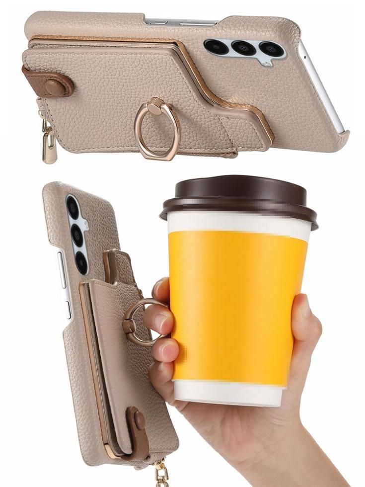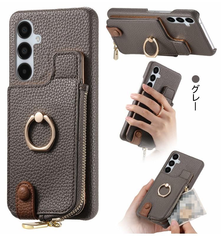 Galaxy A55 5G ケース カバー PUレザー 背面レザーケース 一体型リング付き カード収納 ファスナー付き スリム サムスン ギャラクシー A55 5G