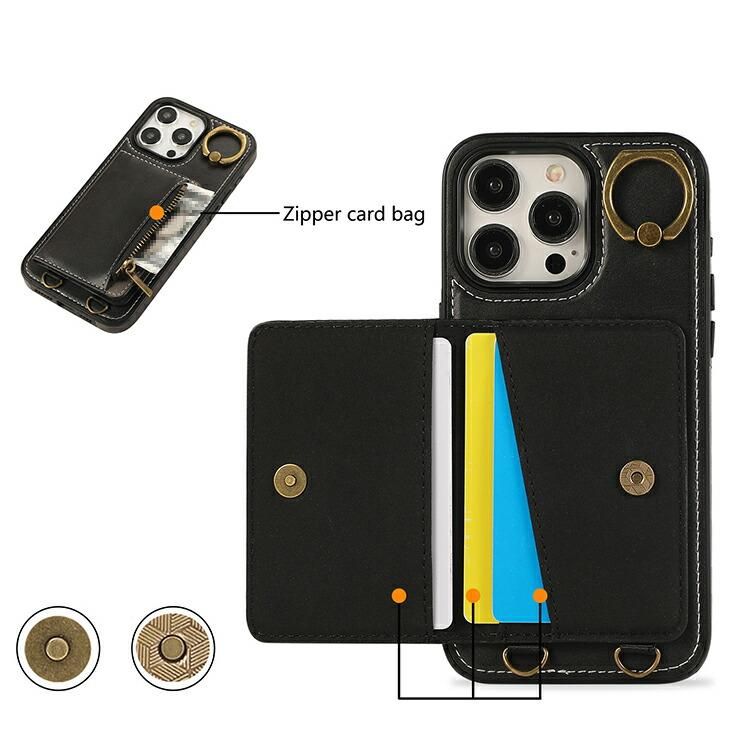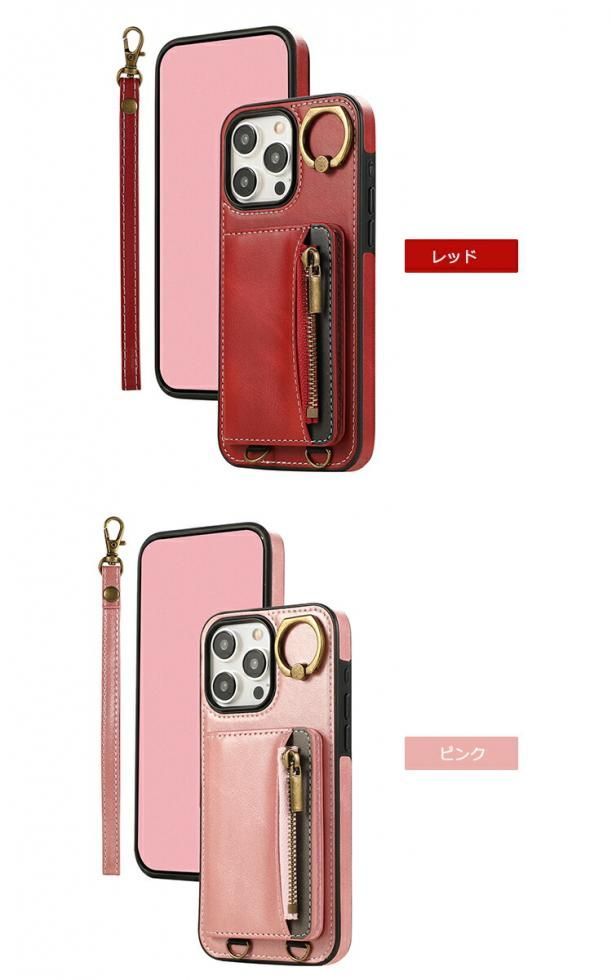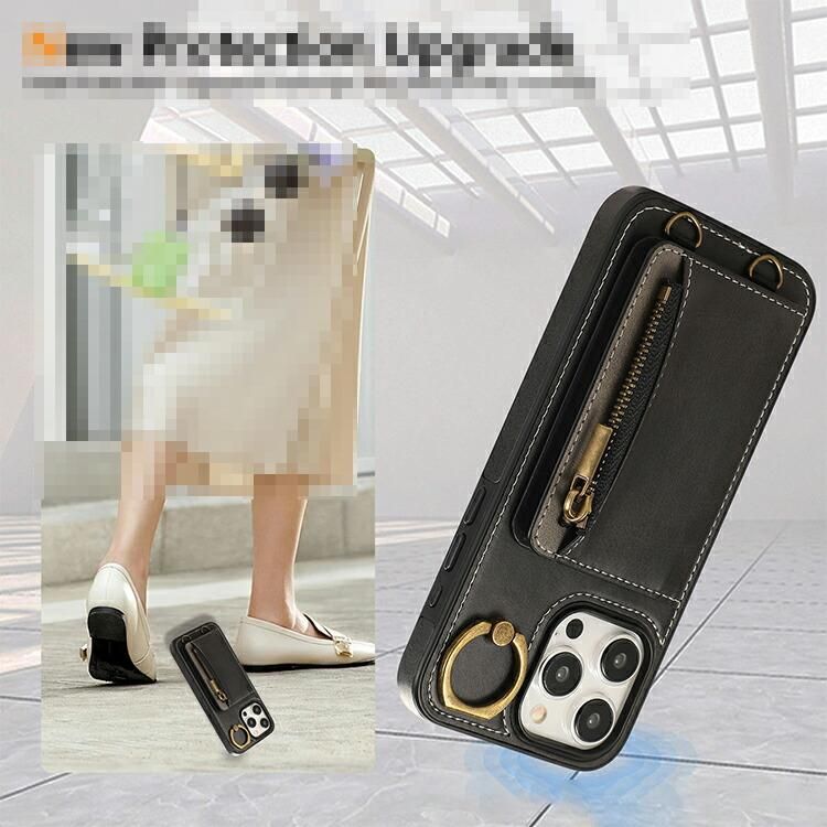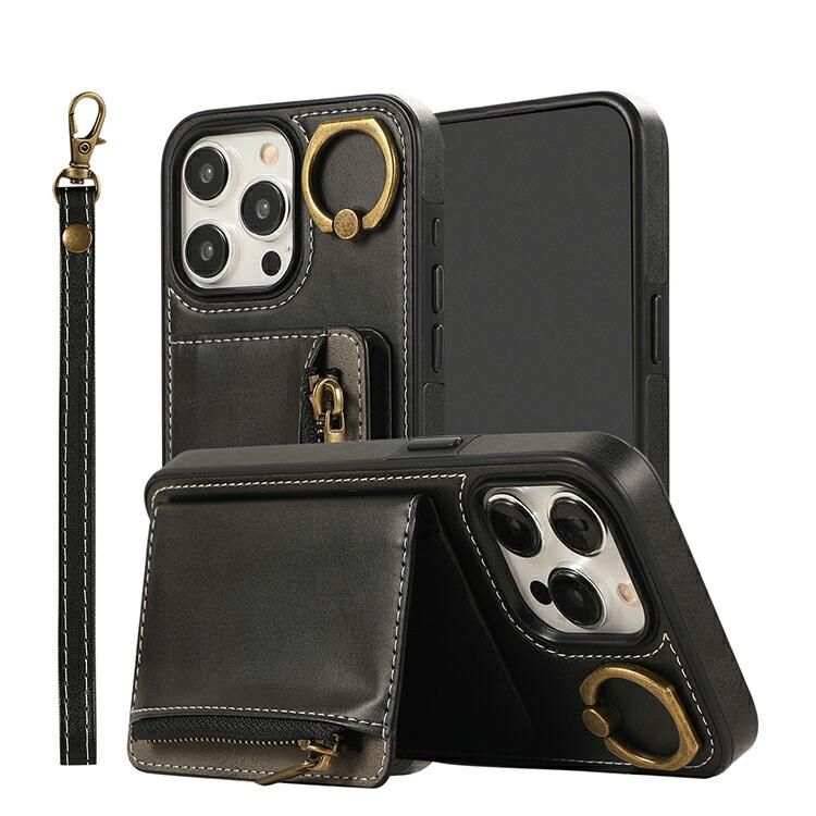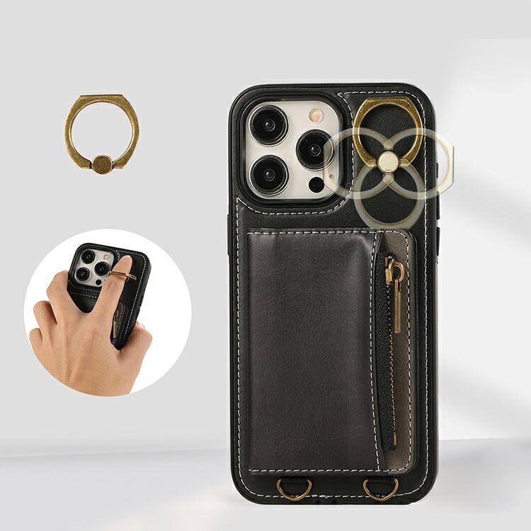 iPhone16 ケース カバー PUレザー 背面ケース 一体型スマホリング付き ストラップ付き スタンド機能 カード収納 おしゃれ