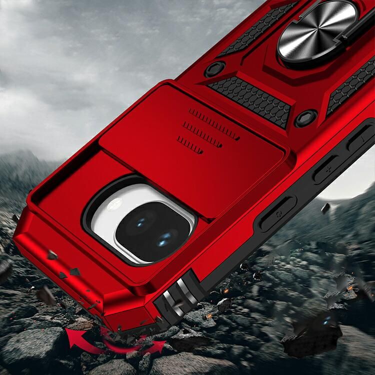 Pixel9a ケース 耐衝撃 カバー スライド式カメラレンズカバー付き レンズ保護 マグネット式車載ホルダー対応 一体型リング付き スタンド機能 2重構造