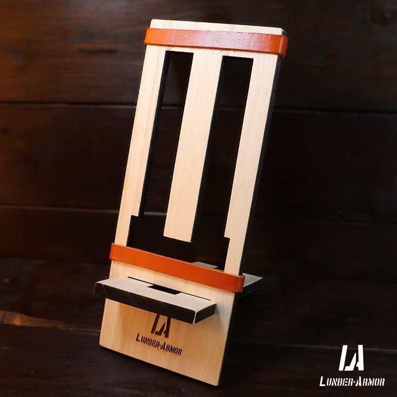 スマホスタンド 木製 収納 コンパクト ハンドメイド ギフト 傷防止のクッションと収納時の固定におしゃれな本革バンド付き 持ち運びに便利 LUNBER-ARMOR -LBAM