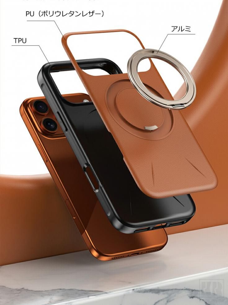 iPhone17 ケース 17 Air/17 Pro/17 Pro Max 耐衝撃 PUレザー+アルミ 背面PUレザーケース Qi充電 ワイヤレス充電 対応 一体型リング付き