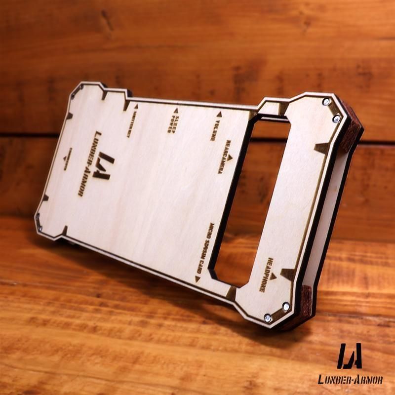 このLUMBER-ARMOR(ランバーアーマー)の木製ケースは、自然素材の木材と本革を組み合わせたハンドメイド製品で、軽くて丈夫な作りが特徴です。